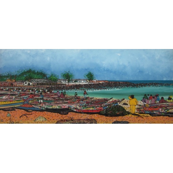 La plage de Soumbedioune à Dakar. Peinture "fixé sous-verre". Format 35x16cm. Signé par l'artiste - 2013.